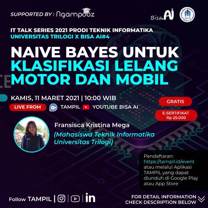 IT Talk Series 2021 Prodi Teknik Informatika Universitas Trilogi x BISA AI#4 - Naive Bayes untuk Klasifikasi Lelang Motor dan Mobil
