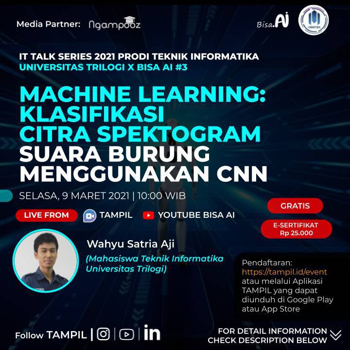 IT Talk Series 2021 Prodi Teknik Informatika Universitas Trilogi x BISA AI#3 - Machine Learning: Klasifikasi Citra Spektogram Suara Burung Menggunakan CNN