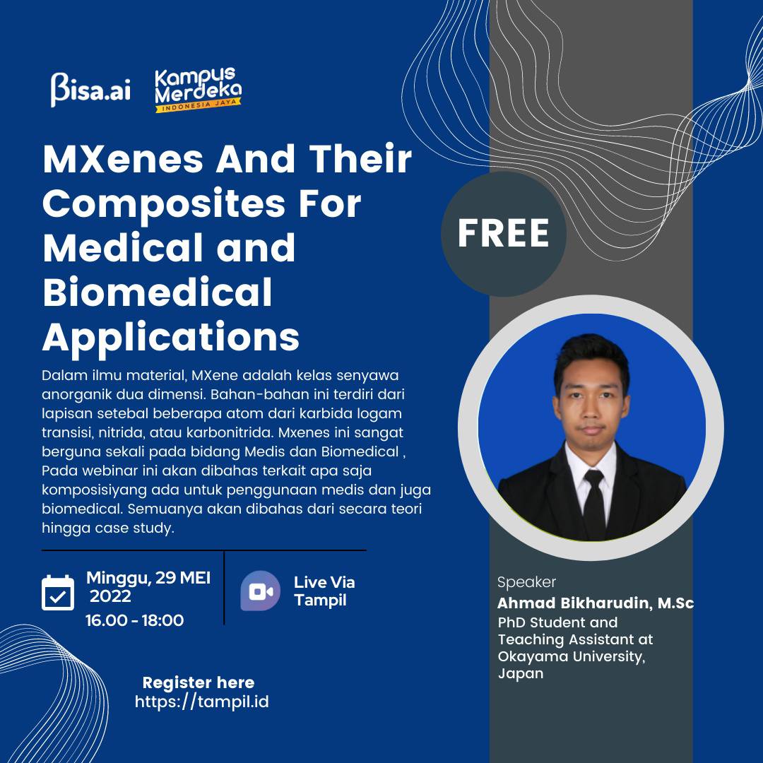 Dalam ilmu material, MXene adalah kelas senyawa anorganik dua dimensi. Bahan-bahan ini terdiri dari lapisan setebal beberapa atom dari karbida logam transisi, nitrida, atau karbonitrida. Mxenes ini sangat berguna sekali pada bidang Medis dan Biomedical , Pada webinar ini akan dibahas terkait apa saja komposisiyang ada untuk penggunaan medis dan juga biomedical. Semuanya akan dibahas dari secara teori hingga case study, Dengan :