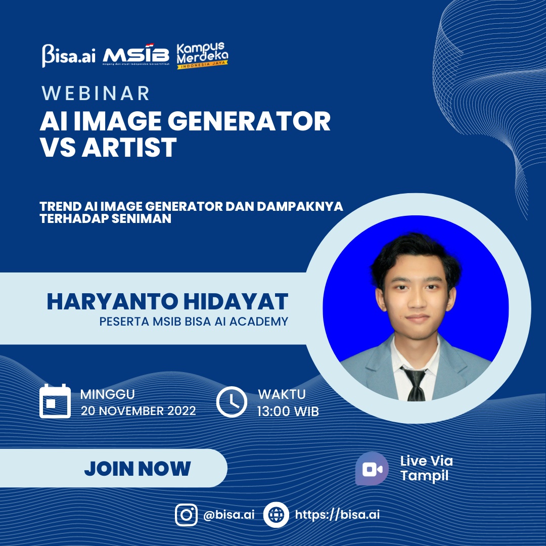 Webinar ini menjelaskan tentang trend AI yang sedang mendunia yaitu AI Image Generator yang menggunakan text-to-image sehingga bisa menghasilkan gambar semi realistik menggunakan AI dengan hanya menerima input berupa teks. Namun hal ini menjadi perbincangan publik karena sebagian beranggapan akan menghilangkan profesi seniman, pada webinar ini akan dibahas dari kedua belah pihak, dengan :