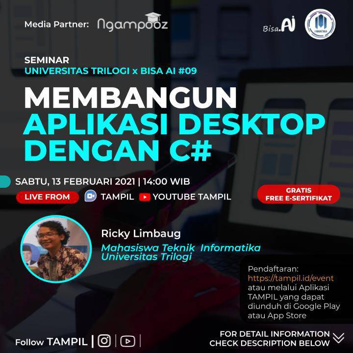 Ikuti Seminar Universitas Trilogi x BISA AI kali ini seputar aplikasi desktop untuk mengetahui lebih jauh dasar dan penerapan C# secara langsung, bersama: