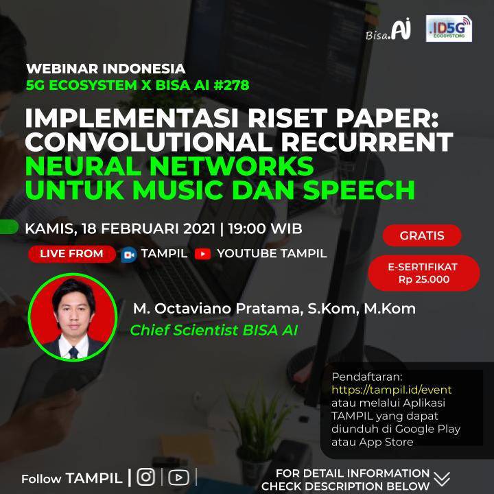 Webinar Indonesia 5G Ecosystem x BISA AI #278 – Implementasi Riset Paper: Convolutional Recurrent Neural Networks Untuk Music dan Speech