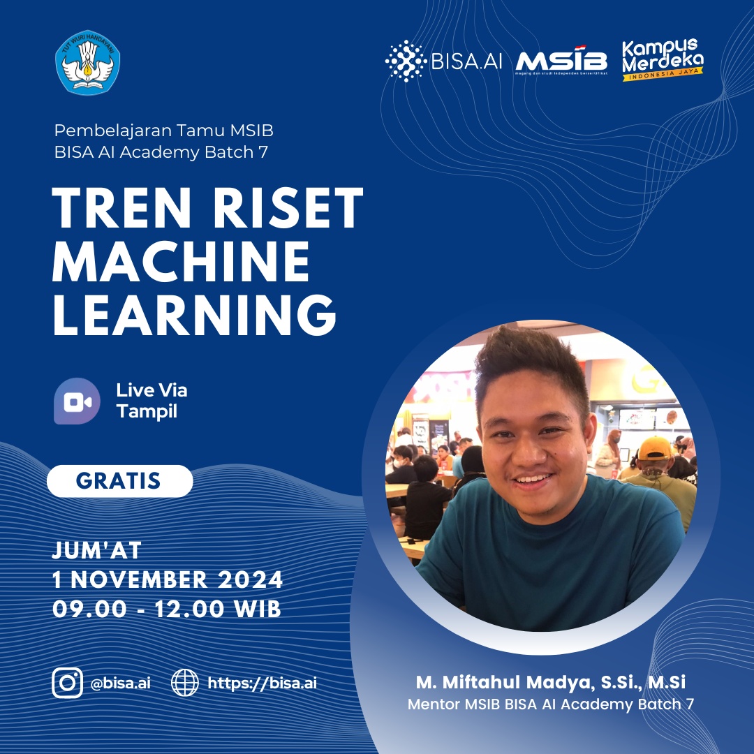 Webinar "Tren Riset Machine Learning" akan membahas perkembangan terbaru dalam bidang machine learning, termasuk teknik dan algoritma inovatif yang sedang tren. Peserta akan diajak mengeksplorasi aplikasi machine learning di berbagai industri, tantangan yang dihadapi dalam penelitian, serta dampak etis dan sosial dari teknologi ini. Dengan menghadirkan pembicara ahli di bidangnya, webinar ini bertujuan untuk memberikan wawasan mendalam dan memicu diskusi interaktif di antara peserta. Bergabunglah untuk memperluas pemahaman Anda dan mendapatkan inspirasi dari tren terkini dalam riset machine learning!