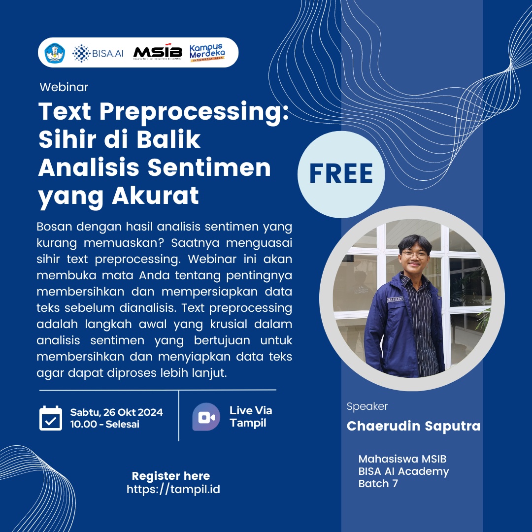 Bosan dengan hasil analisis sentimen yang kurang memuaskan? Saatnya menguasai sihir text preprocessing. Webinar ini akan membuka mata Anda tentang pentingnya membersihkan dan mempersiapkan data teks sebelum dianalisis. Text preprocessing adalah langkah awal yang krusial dalam analisis sentimen yang bertujuan untuk membersihkan dan menyiapkan data teks agar dapat diproses lebih lanjut.